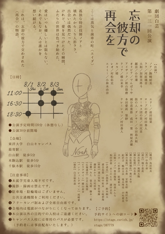 | スタッフ | 【演出助手】風間太陽 【舞台監督】由木貴 【舞台監督補佐】奥村未空 【舞台美術】由木貴・案野友絵・嶋田圭汰・八杉泰洋・結城新太・中村愛美・紀沢言・ 瑞木理功・ネネ 【衣装メイク】豊田陽梨・阿部かんな・坂田奈那・水上のえる・満田京花 【小道具】小池梨沙・鈴木絢太・田中拓未・渡会花梨・土岐碧海 【照明】遠山実知・笠原瑞輝・藤原あかり・吉村咲南 【音響】みた・張光晴・藤本一希 【広報運営】白芸広報部 【ビラデザイン】横山来幸 【パンフレットデザイン】尾崎愛 【制作】白芸制作部 |